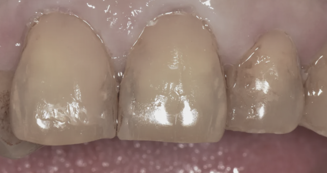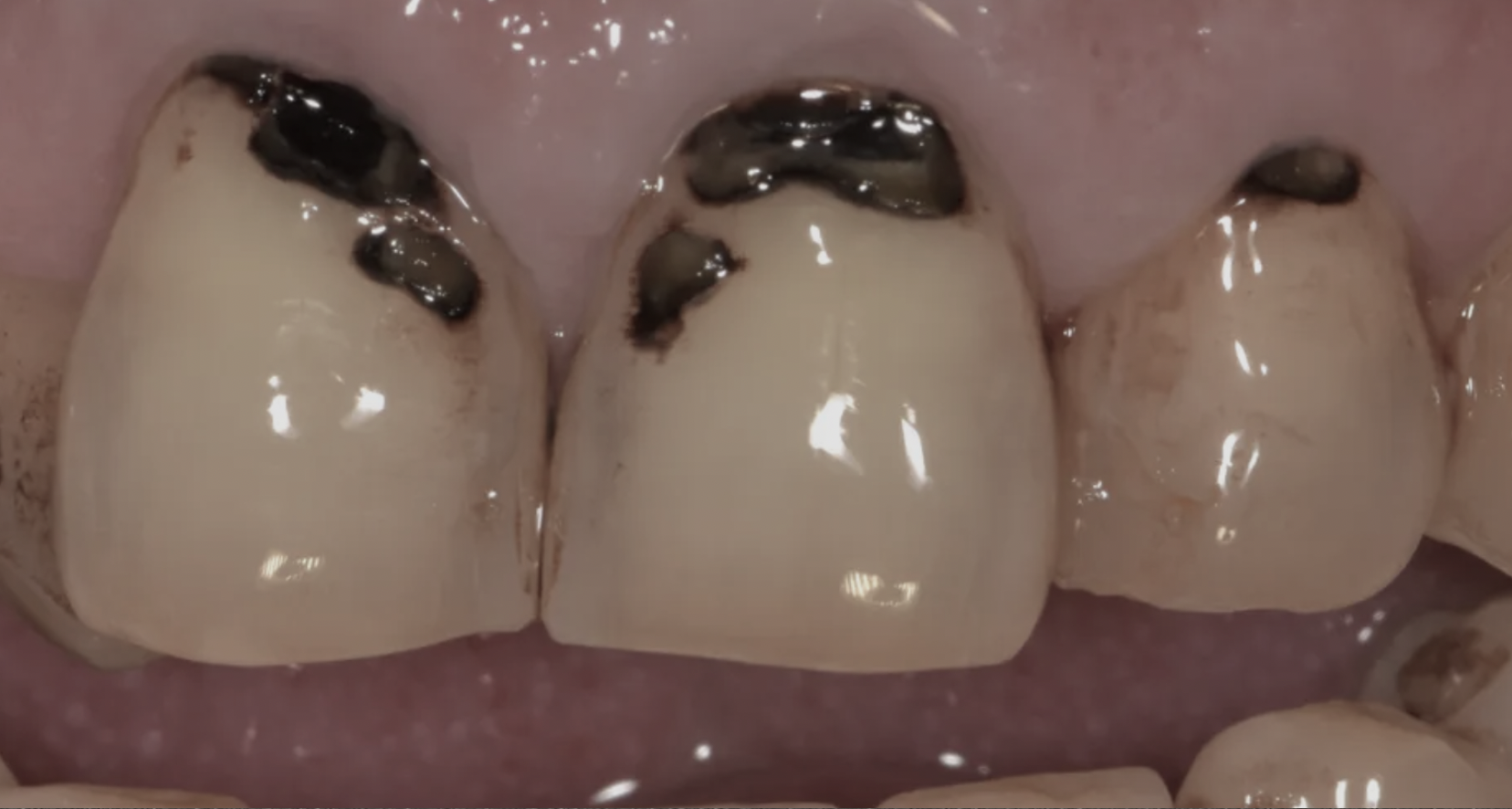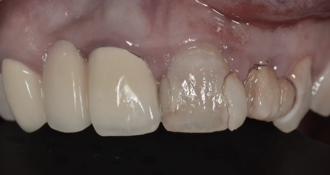 前牙有大範圍舊補牙和二次蛀牙的狀況,齒質缺損超過一半。樹脂已經撐不住,貼片也無法提供足夠的保護。